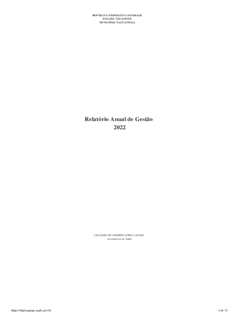 REPBLICA FEDERATIVA DO BRASIL ESTADO: TOCANTINS MUNICPIO: TAGUATINGARelatrio Anual de Gesto 2022LEANDRO DE AMORIM LOPES CASTRO Secretrio(a) de Sadehttps://digisusgmp.saude.gov.br1 de 31Sumrio 1. Identificao