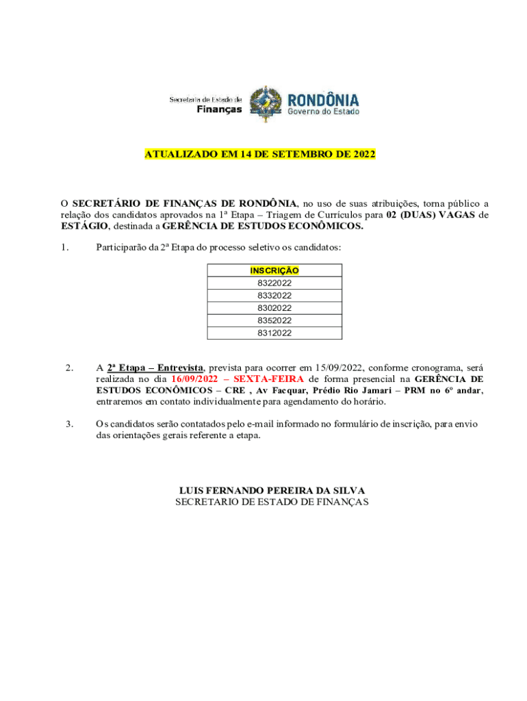 Obtenha o gratuito SEFIN-RO COMUNICADO - Aprovados na 1 Etapa - Assessor III
