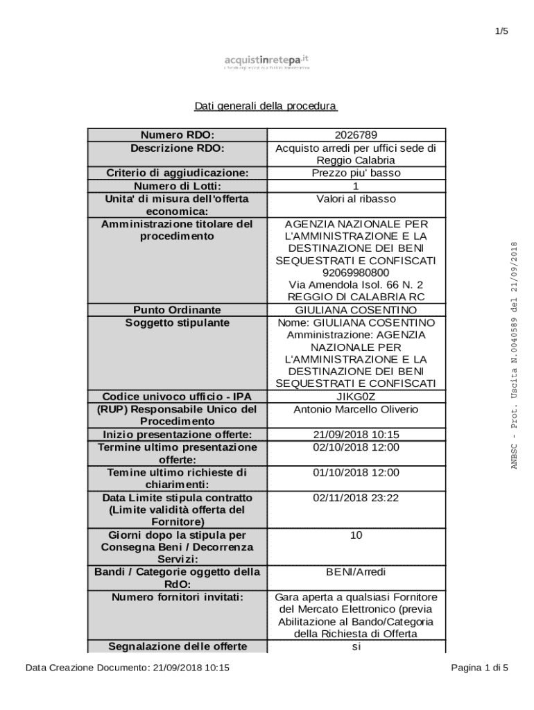 1/5Dati generali della proceduraCriterio di aggiudicazione: Numero di Lotti: Unita\' di misura dell\'offerta economica: Amministrazione titolare del procedimentoPunto Ordinante Soggetto stipulanteCodice