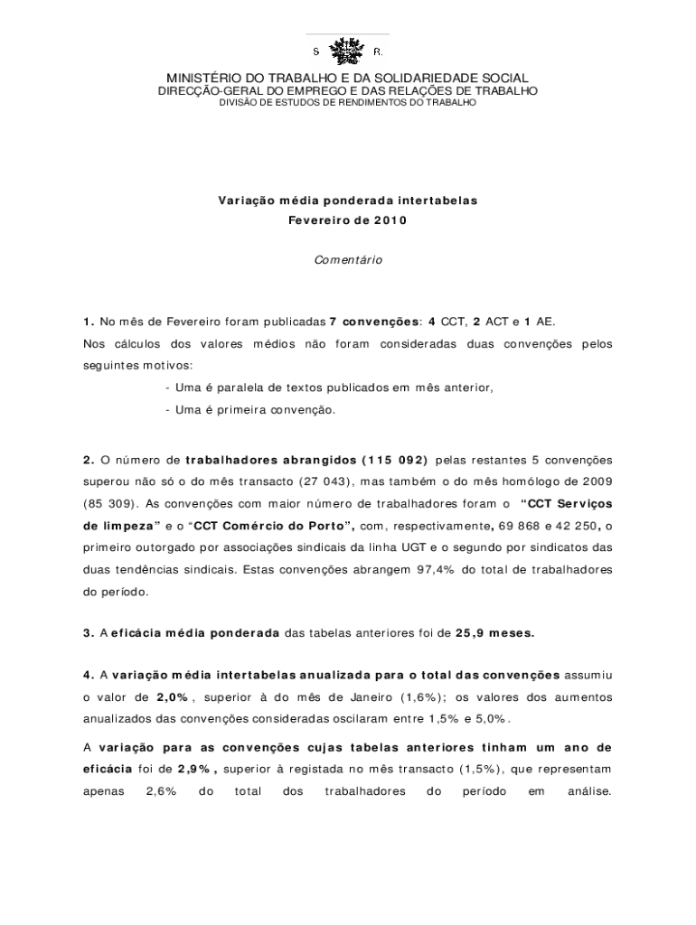 MINISTRIO DO TRABALHO E DA SOLIDARIEDADE SOCIAL DIRECOGERAL DO EMPREGO E DAS RELAES DE TRABALHO DIVISO DE ESTUDOS DE RENDIMENTOS DO TRABALHOVariao mdia ponderada intertabelas Fevereiro de 2010 Comentrio1.