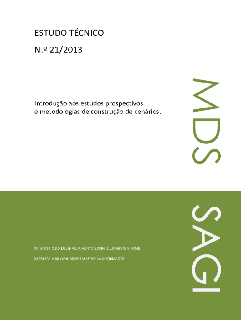 ESTUDO TCNICO N. 21/2013Introduo aos estudos prospectivos e metodologias de construo de cenrios.MINISTRIO DO DESENVOLVIMENTO SOCIAL E COMBATE FOME SECRETARIA DE AVALIAO E GESTO DA INFORMAO1Estudo