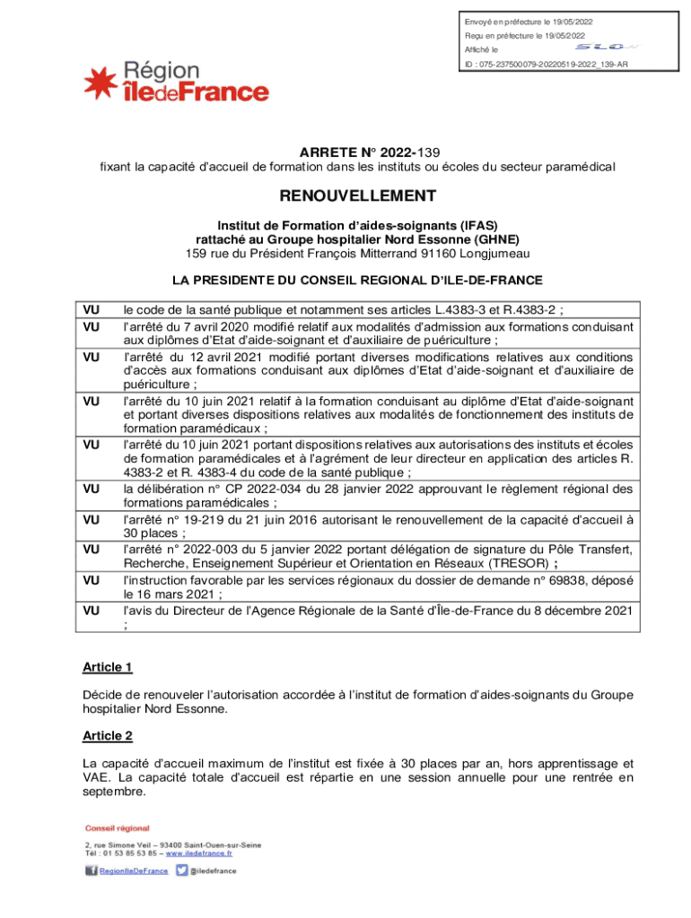 Envoy en prfecture le 19/05/2022 Reu en prfecture le 19/05/2022 Affich le ID : 075237500079202205192022_139ARARRETE N 2022 139fixant la capacit daccueil de formation dans les instituts ou coles du