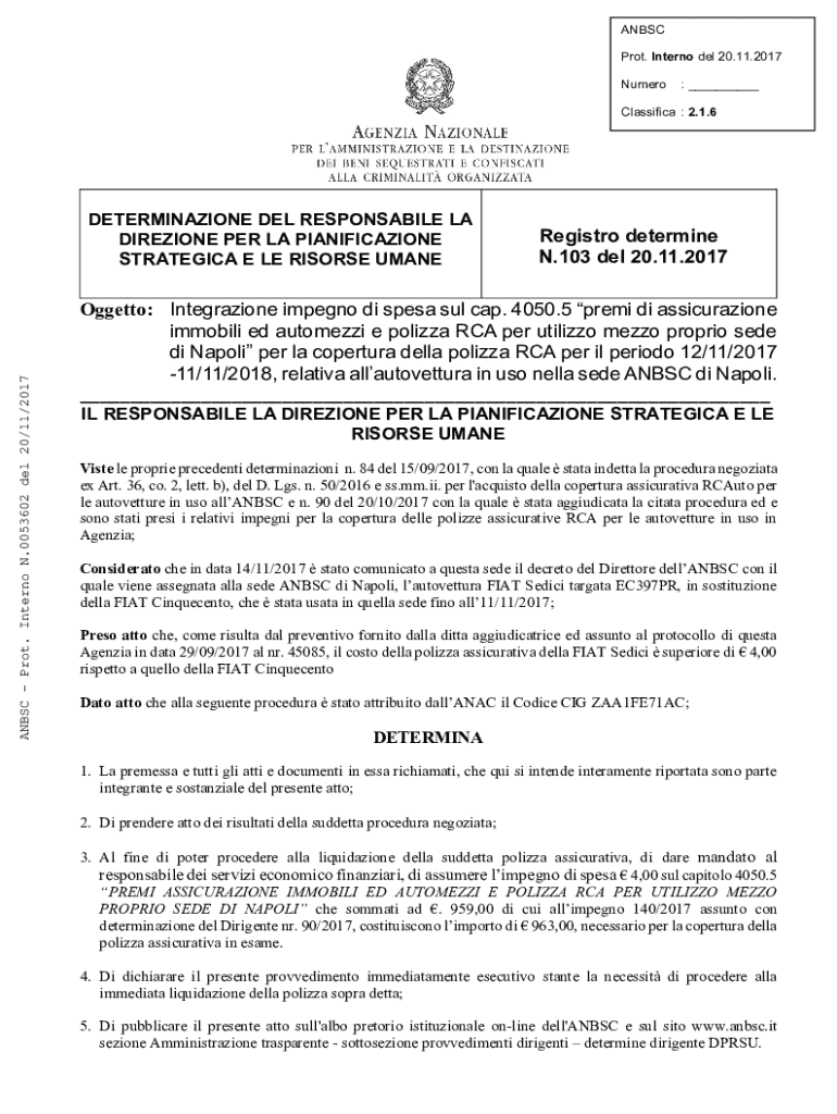 Determinazione del Responsabile della Direzione per la Pianificazione Strategica e le Risorse Umane riguardante l\'integrazione del impegno di spesa per la copertura della polizza RCA per un\'autovettura