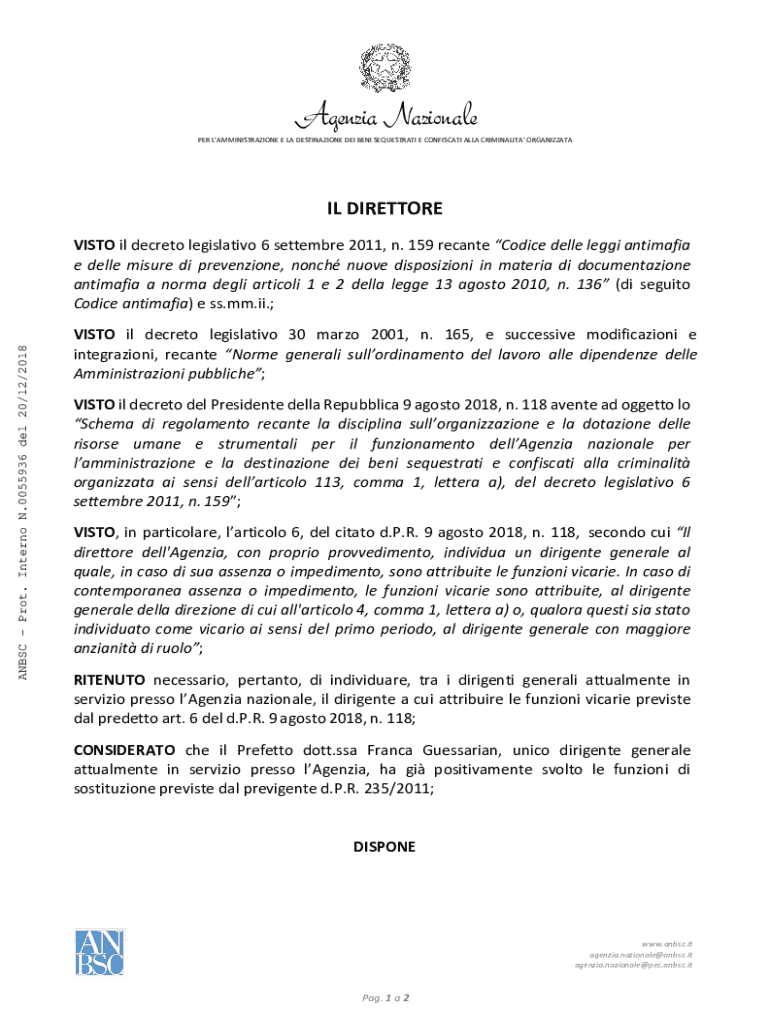 Agenzia Nazionale PER LAMMINISTRAZIONE E LA DESTINAZIONE DEI BENI SEQUESTRATI E CONFISCATI ALLA CRIMINALITA ORGANIZZATAIL DIRETTOREANBSC Prot. Interno N.0055936 del 20/12/2018VISTO il decreto legislativo