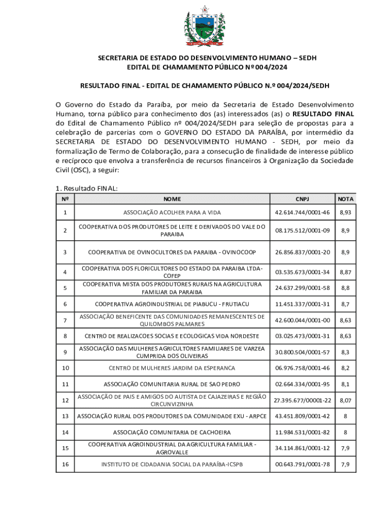 O resultado final do Edital de Chamamento Público nº 004/2024/SEDH para seleção de propostas para a celebração de parcerias com o Governo do Estado da Paraíba, visando a transferência de recursos