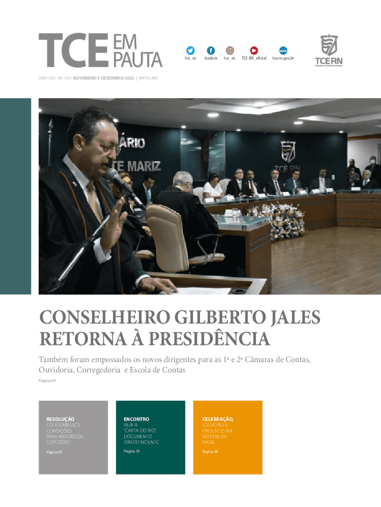 Edição do Tribunal de Contas do Estado do Rio Grande do Norte, abordando temas como posse da nova diretoria, celebrações, resoluções sobre emissão de certidões e fiscalização de emendas