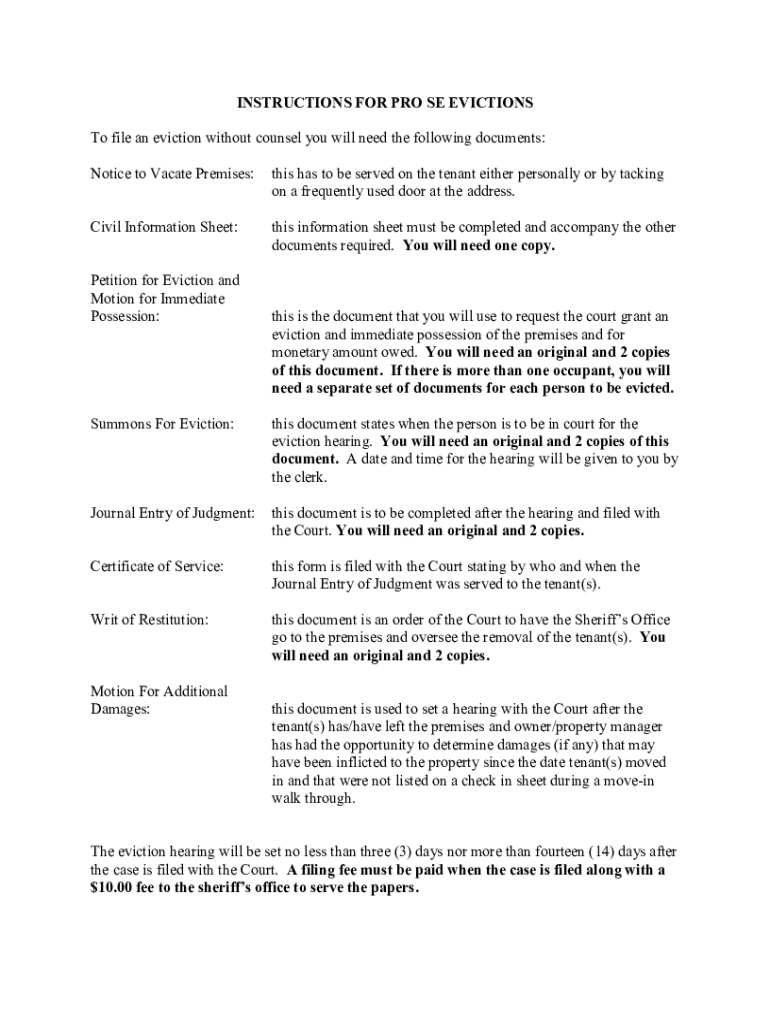 INSTRUCTIONS FOR PRO SE EVICTIONS To file an eviction without counsel you will need the following documents: Notice to Vacate Premises:this has to be served on the tenant either personally or by tacking