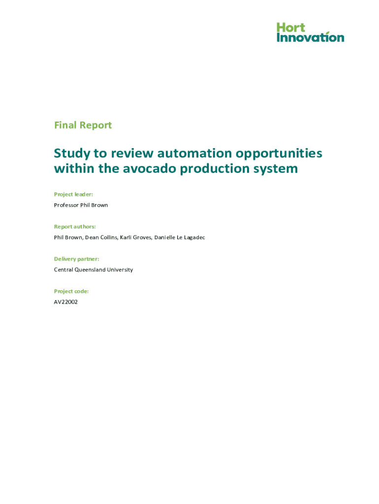 This final report presents the findings of a study aimed at identifying automation opportunities in the avocado production system. Conducted by Central Queensland University under the leadership of Professor Phil Brown, the project examined labor-intensive processes in avocado farming and the potential for technology adoption to improve efficiency and productivity. The report summarizes methodologies, results from grower surveys and interviews, time and motion studies, and recommendations for...