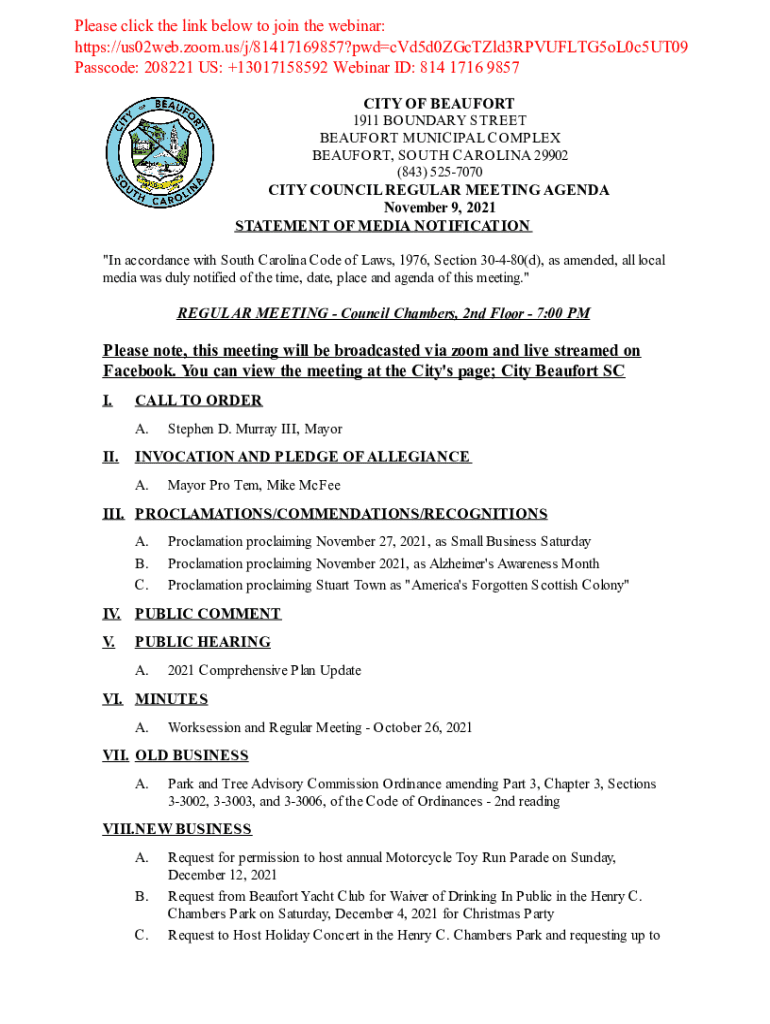 Please click the link below to join the webinar: https://us02web.zoom.us/j/81417169857?pwdcVd5d0ZGcTZld3RPVUFLTG5oL0c5UT09 Passcode: 208221 US: +13017158592 Webinar ID: 814 1716 9857CITY OF BEAUFORT