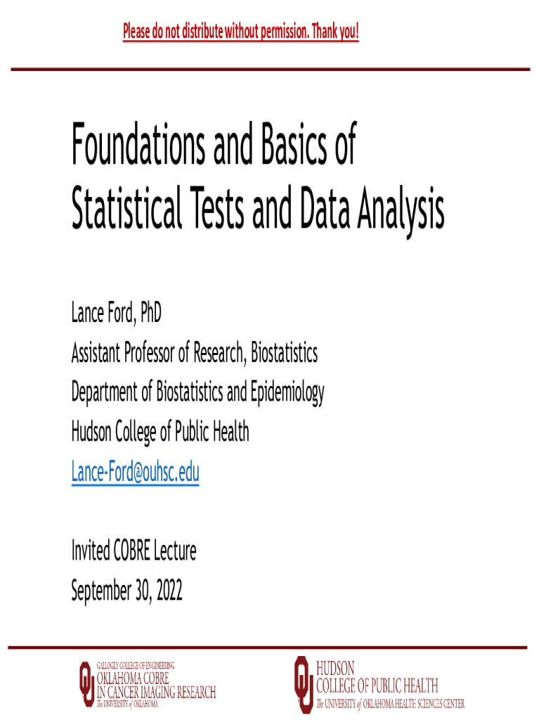 Please do not distribute without permission. Thank you!Foundations and Basics of Statistical Tests and Data Analysis Lance Ford, PhD Assistant Professor of Research, Biostatistics Department of Biostatistics