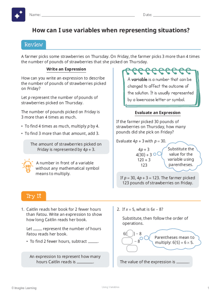 Name: ___Date: ___How can I use variables when representing situations? Review A farmer picks some strawberries on Thursday. On Friday, the farmer picks 3 more than 4 times the number of pounds of