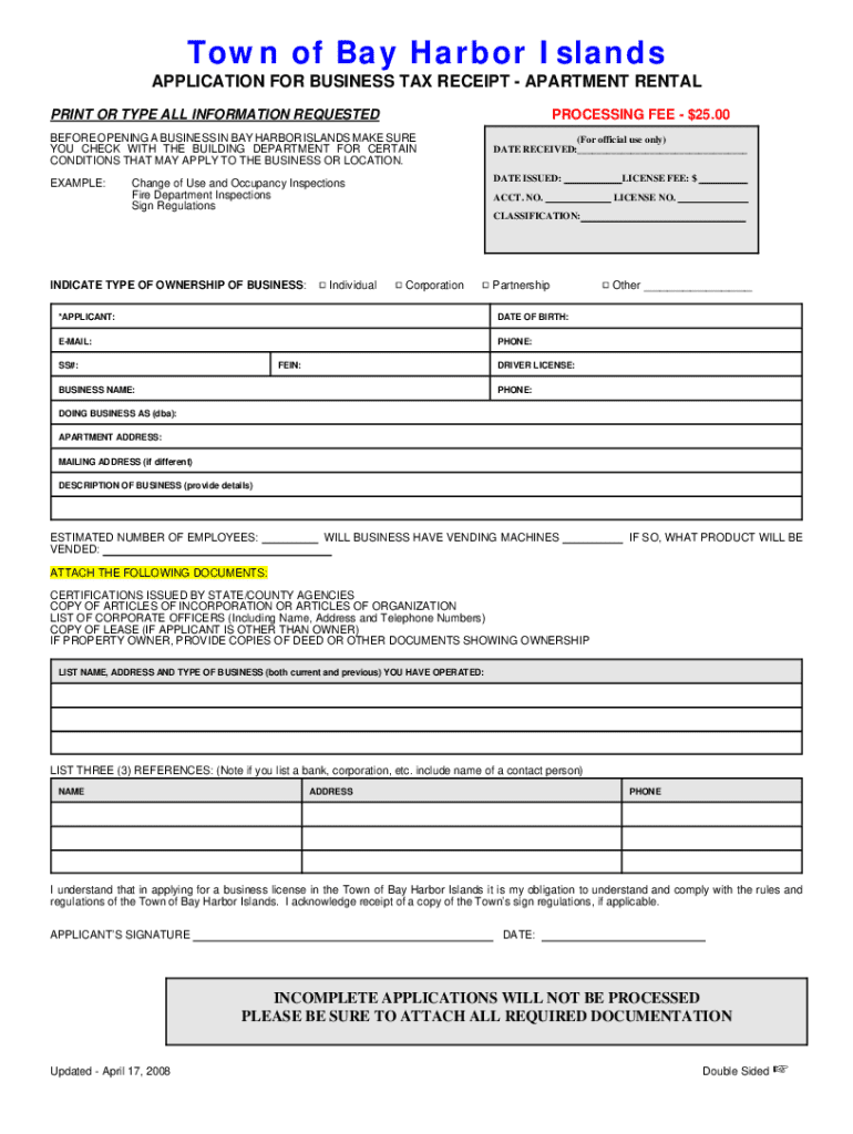 TOWN OF BAY HARBOR ISLANDS 9665 Bay Harbor Terrace Bay Harbor Islands, FL 33154 Tel (305) 8666241 Fax 3058664863BUSINESS TAX RECEIPT REQUIRED DOCUMENTS CHECKLIST APARTMENT RENTAL ___Bay Harbor Islands