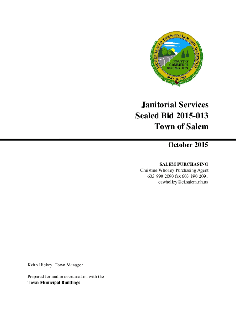 Janitorial Services Sealed Bid 2015013 Town of Salem October 2015 SALEM PURCHASING Christine Wholley Purchasing Agent 6038902090 fax 6038902091 cawholley@ci.salem.nh.usKeith Hickey, Town Manager Prepared
