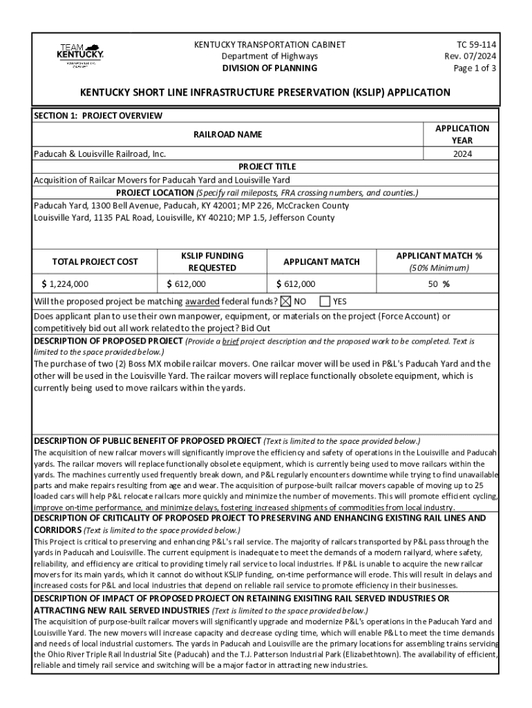 TC 59114 Rev. 07/2024 Page 1 of 3KENTUCKY TRANSPORTATION CABINET Department of Highways DIVISION OF PLANNINGKENTUCKY SHORT LINE INFRASTRUCTURE PRESERVATION (KSLIP) APPLICATION SECTION 1: PROJECT OVERVIEW