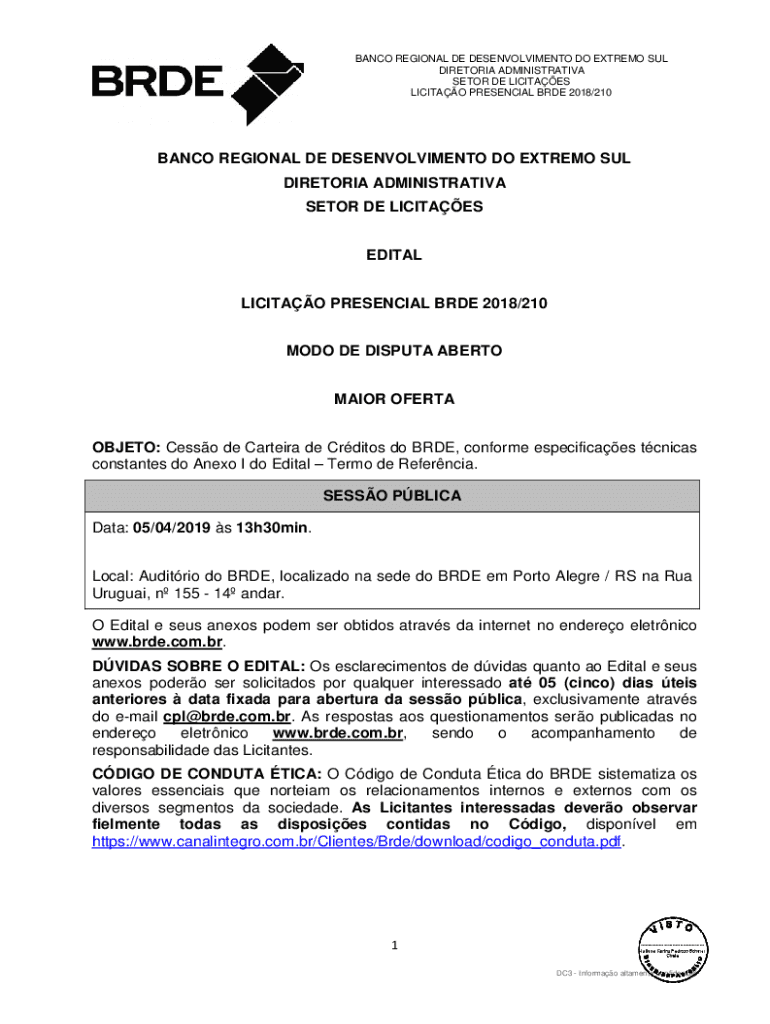BANCO REGIONAL DE DESENVOLVIMENTO DO EXTREMO SUL DIRETORIA ADMINISTRATIVA SETOR DE LICITAES LICITAO PRESENCIAL BRDE 2018/210BANCO REGIONAL DE DESENVOLVIMENTO DO EXTREMO SUL DIRETORIA ADMINISTRATIVA