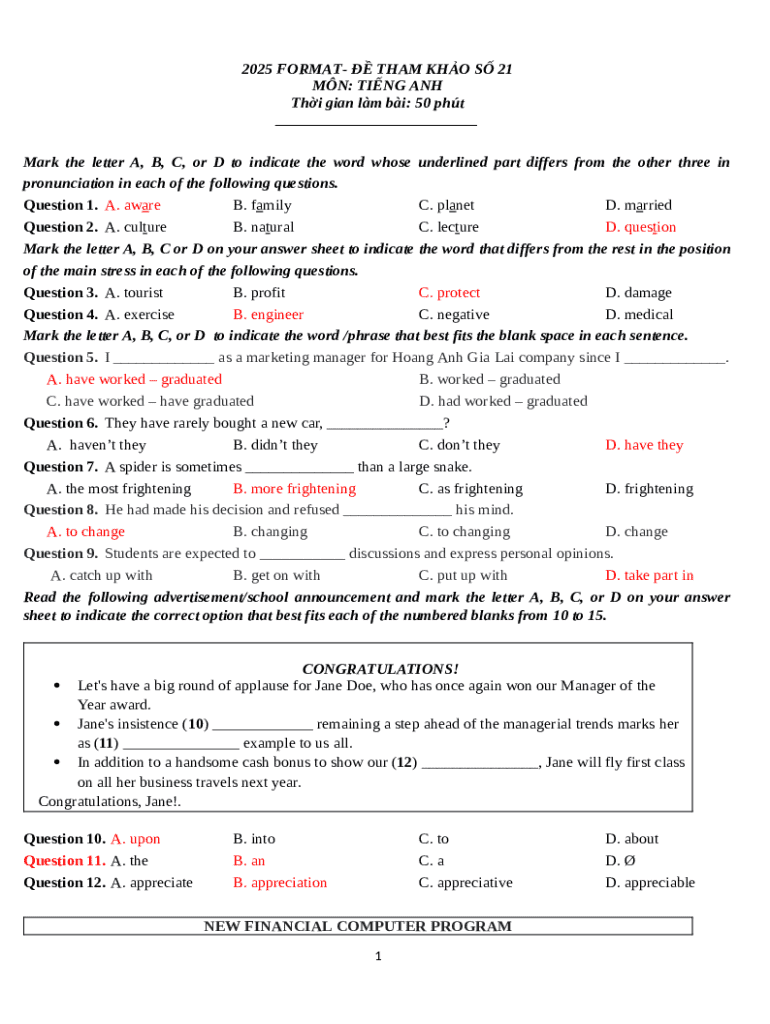 2025 FORMAT THAM KHO S 21 MN: TING ANH Thi gian lm bi: 50 pht ___ Mark the letter A, B, C, or D to indicate the word whose underlined part differs from the other three in pronunciation in each of