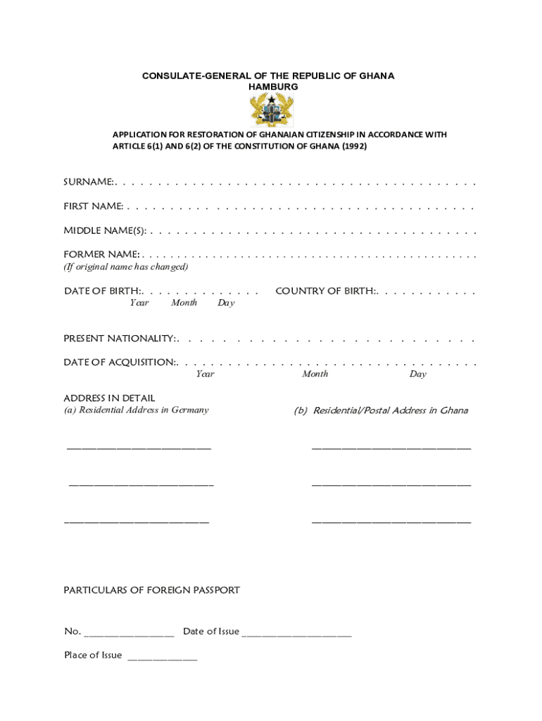 This document is an official application form for individuals seeking to restore their Ghanaian citizenship in accordance with Article 6(1) and 6(2) of the Constitution of Ghana (1992). It includes sections for personal information, requirements for the application, and instructions regarding supporting documents and processes.