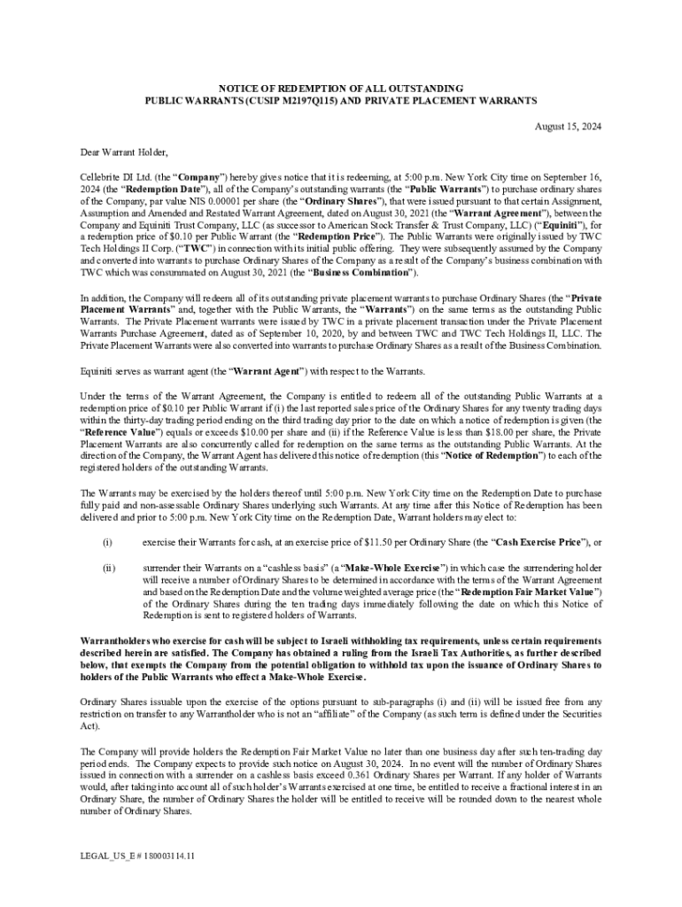 NOTICE OF REDEMPTION OF ALL OUTSTANDING PUBLIC WARRANTS (CUSIP M2197Q115) AND PRIVATE PLACEMENT WARRANTS August 15, 2024 Dear Warrant Holder, Cellebrite DI Ltd. (the Company) hereby gives notice that