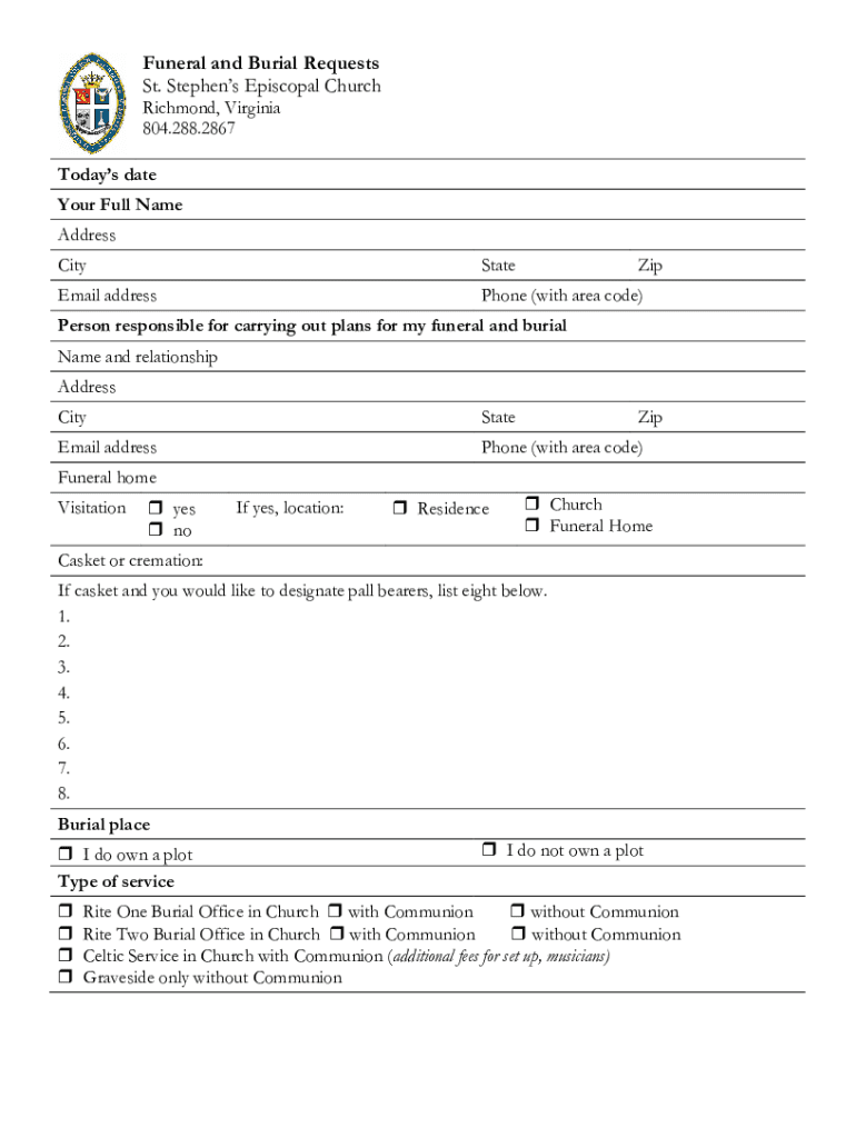Funeral and Burial Requests St. Stephens Episcopal Church Richmond, Virginia 804.288.2867 Todays date Your Full Name Address CityStateZipEmail addressPhone (with area code)Person responsible for carrying
