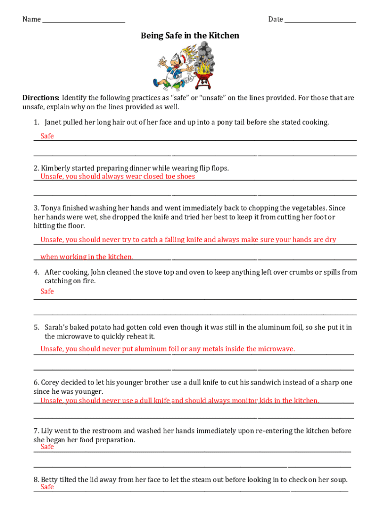 This document provides a series of scenarios to identify safe and unsafe kitchen practices. It encourages users to analyze behaviors while cooking and food preparation to enhance kitchen safety awareness.