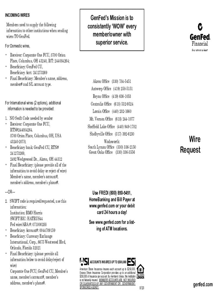 This document provides instructions and necessary information for members sending incoming wire transfers to GenFed. It highlights the required details for domestic and international wires, including routing numbers, beneficiary information, and necessary documentation. It ensures members are informed about the proper procedures and regulations related to wire transfers.
