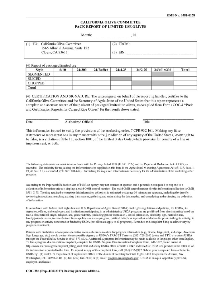 This document is a Pack Report submitted to the California Olive Committee for reporting the packout of packaged limited use olives. It includes sections for the date, reporting handler information, styles of olives packaged, and a certification statement verifying the accuracy of the report in compliance with USDA marketing order provisions.