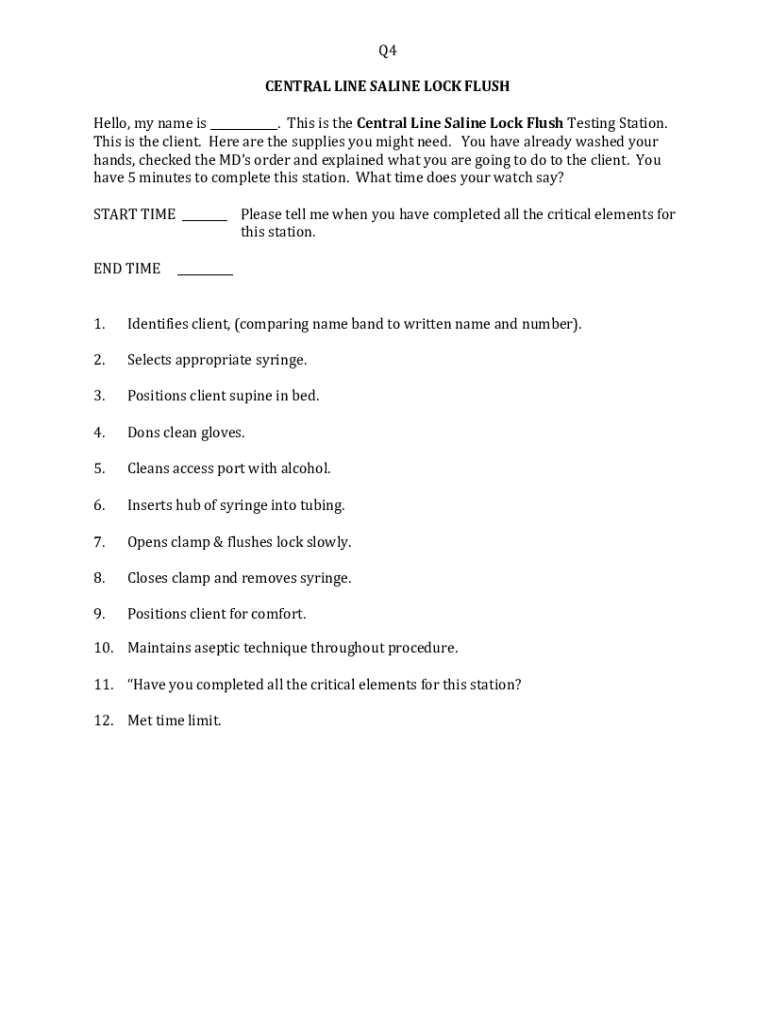 Q4CENTRALLINESALINELOCKFLUSH Hello,mynameis___.ThisistheCentralLineSalineLockFlushTestingStation. Thisistheclient.Herearethesuppliesyoumightneed.Youhavealreadywashedyour hands,checkedtheMDsorderandexplainedwhatyouaregoingtodototheclient