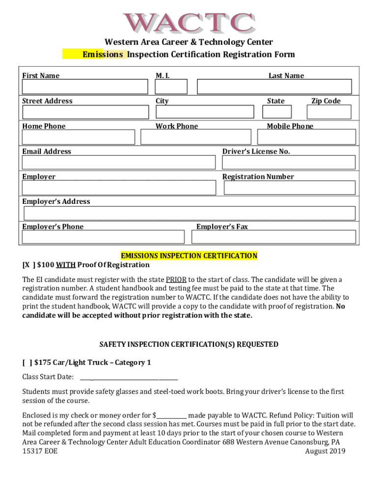 This form is used for registering candidates for emissions inspection certification at the Western Area Career & Technology Center. It requires personal information, proof of registration with the state, and payment details.
