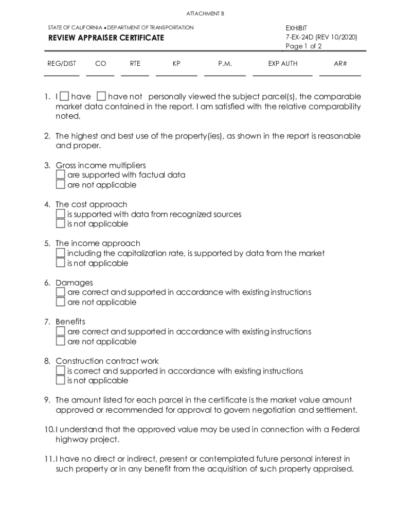 ATTACHMENT BEXHIBIT 7EX24D (REV 10/2020) Page 1 of 2STATE OF CALIFORNIA DEPARTMENT OF TRANSPORTATIONREVIEW APPRAISER CERTIFICATE REG/DISTCORTEKPP.M.EXP AUTHAR#1. I have have not personally viewed