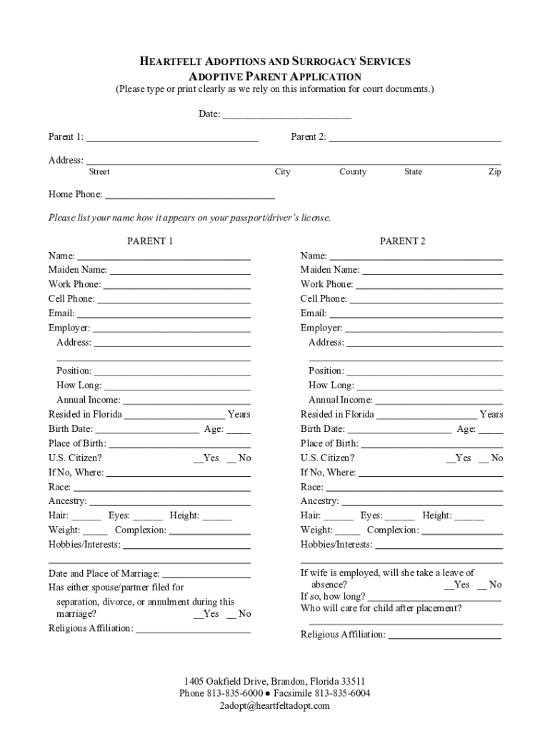 HEARTFELT ADOPTIONS AND SURROGACY SERVICES ADOPTIVE PARENT APPLICATION(Please type or print clearly as we rely on this information for court documents.) Date: ___ Parent 1: Address:Parent 2: StreetCityCountyStateZipHome