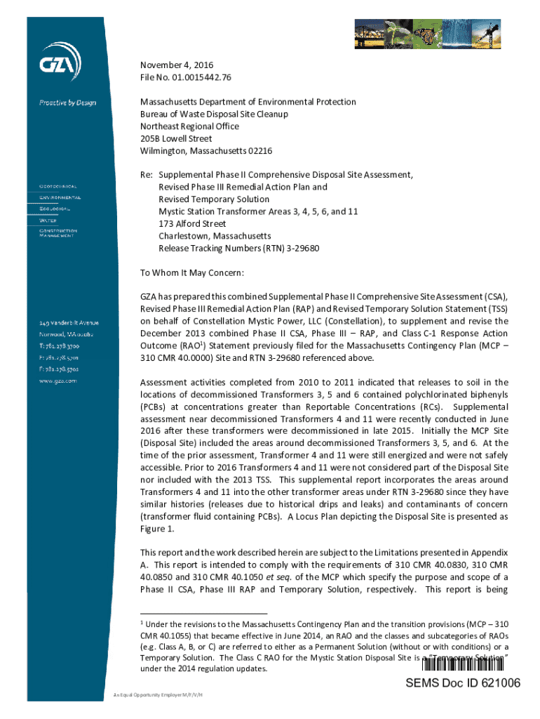 November 4, 2016 File No. 01.0015442.76 Massachusetts Department of Environmental Protection Bureau of Waste Disposal Site Cleanup Northeast Regional Office 205B Lowell Street Wilmington, Massachusetts