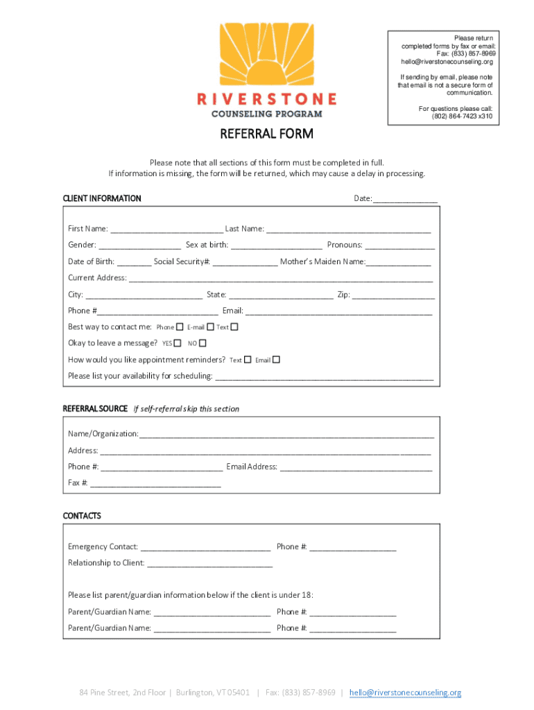 Please return completed forms by fax or email: Fax: (833) 8578969 hello@riverstonecounseling.org If sending by email, please note that email is not a secure form of communication. For questions please