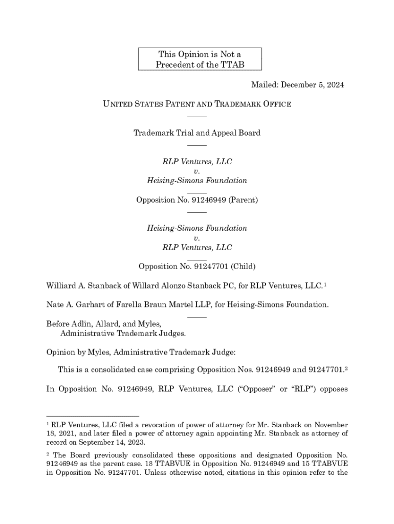 This document is an opinion issued by the Trademark Trial and Appeal Board regarding the opposition cases between RLP Ventures, LLC and the Heising-Simons Foundation concerning trademark applications. The document analyzes the likelihood of confusion between the marks of the parties involved, addressing various factors as per trademark law, ultimately concluding that the oppositions are dismissed.