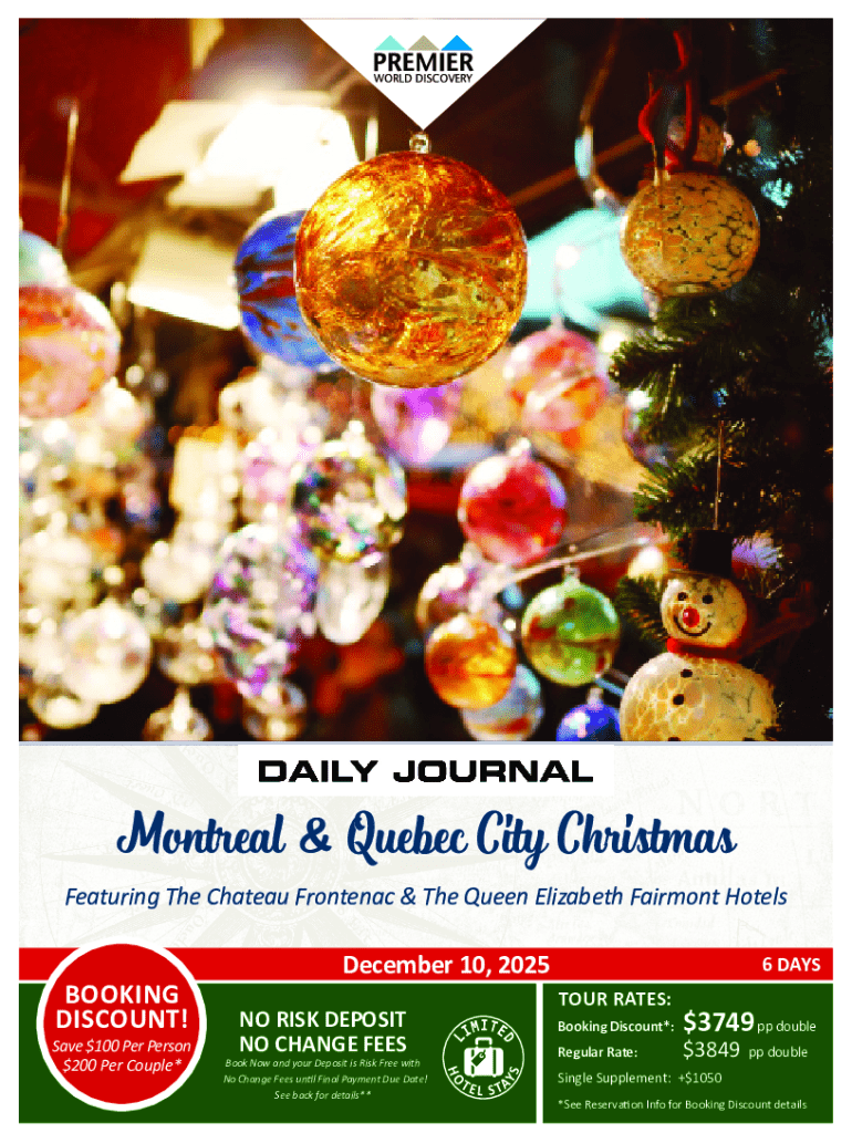 Montreal & Quebec City Christmas Featuring The Chateau Frontenac & The Queen Elizabeth Fairmont HotelsBOOKING DISCOUNT!Save $100 Per Person $200 Per Couple*December24, 10,2021 2025 September NO RISK