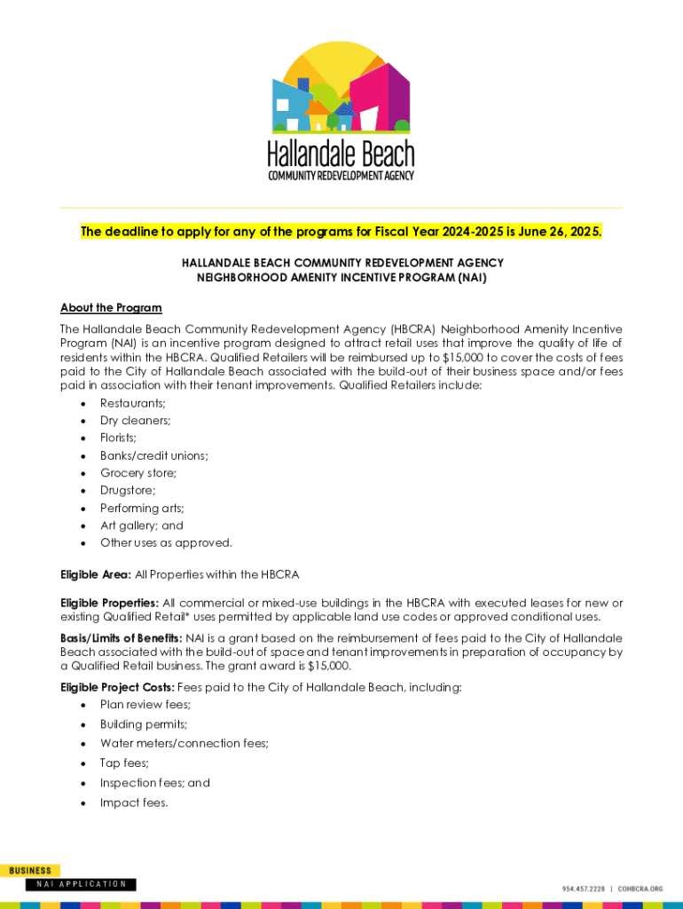 The deadline to apply for any of the programs for Fiscal Year 20242025 is June 26, 2025. HALLANDALE BEACH COMMUNITY REDEVELOPMENT AGENCY NEIGHBORHOOD AMENITY INCENTIVE PROGRAM (NAI) About the Program