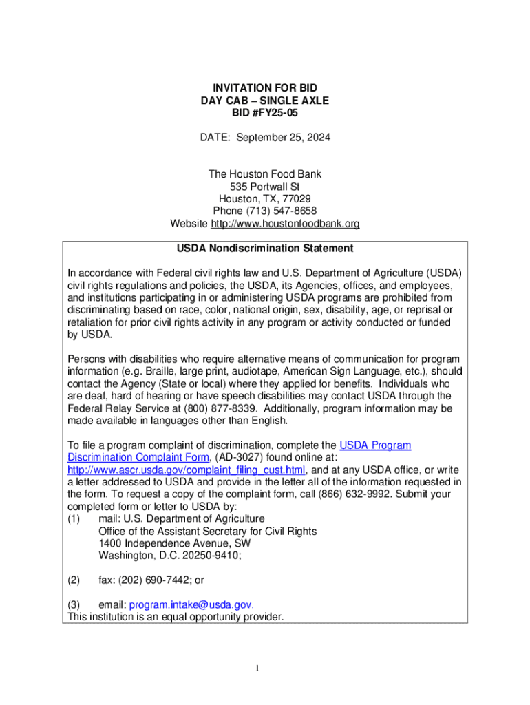 This document serves as an invitation for bids for the procurement of a Day Cab – Single Axle vehicle by the Houston Food Bank, detailing the submission guidelines, bid conditions, expected specifications, and compliance requirements along with the associated terms and conditions for potential bidders.