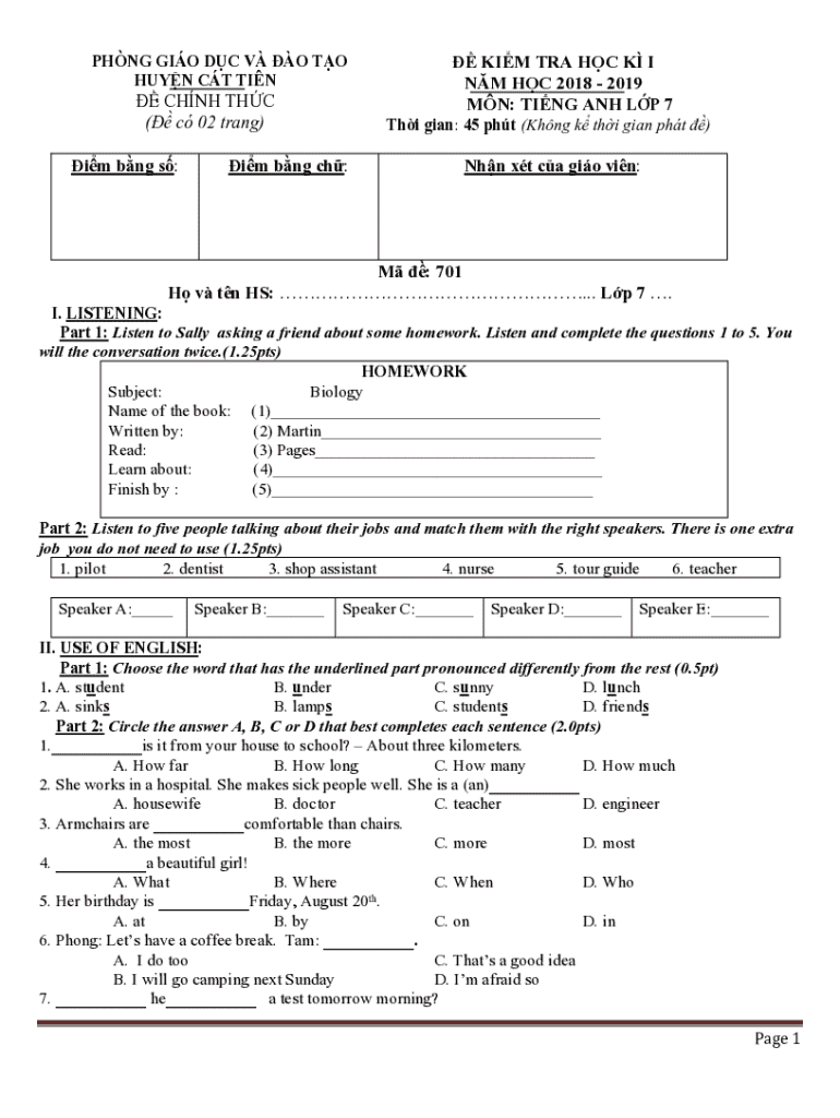 PHNG GIO DC V O TO HUYN CT TIN CHNH THC ( c 02 trang) im bng s: KIM TRA HC K I NM HC 2018 2019 MN: TING ANH LP 7 Thi gian: 45 pht (Khng k thi gian pht )im bng ch:Nhn xt ca gio vin:M : 701 H v tn HS:
