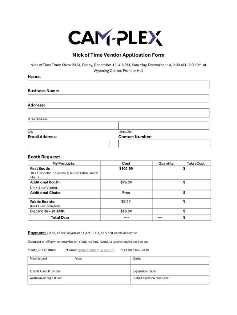 Nick of Time Vendor Application Form Nick of Time Trade Show 2024, Friday, December 13, 48 PM, Saturday, December 14, 9:00 AM 2:00 PM at Wyoming Center, Frontier HallName: Business Name: Address:
