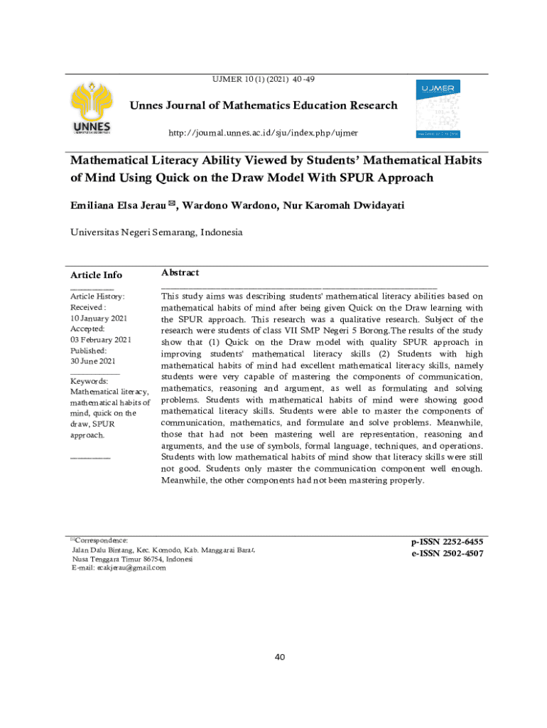 UJMER 10 (1) (2021) 40 49Unnes Journal of Mathematics Education Research http://journal.unnes.ac.id/sju/index.php/ujmerMathematical Literacy Ability Viewed by Students Mathematical Habits of Mind