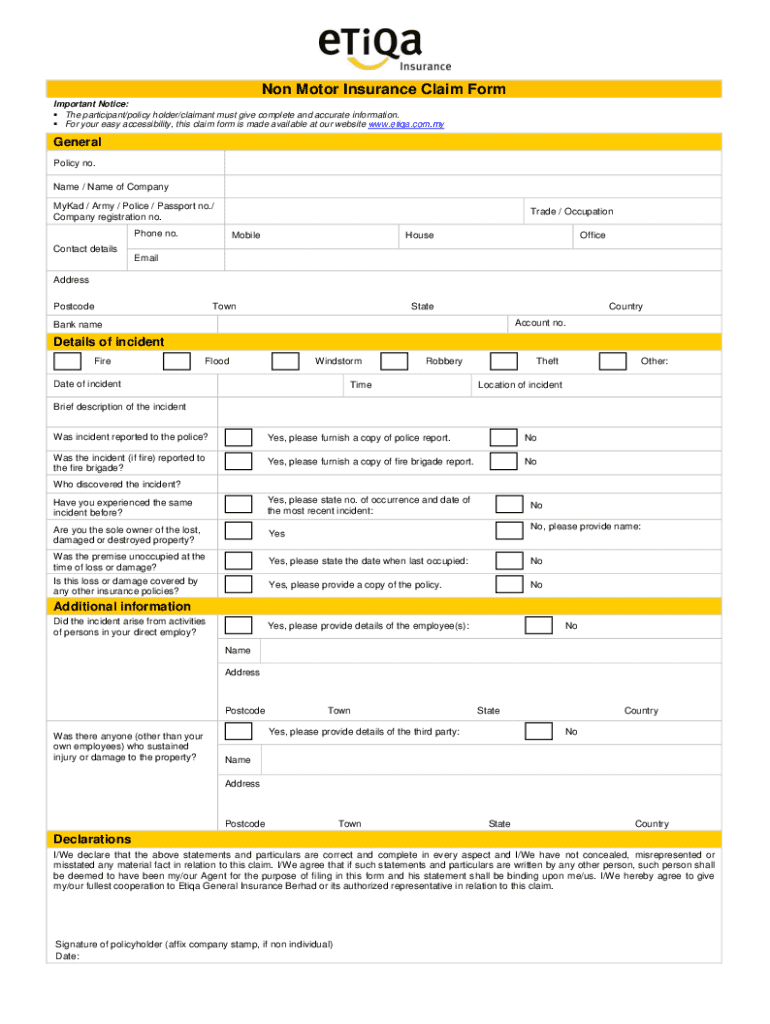 Non Motor Insurance Claim Form Important Notice: The participant/policy holder/claimant must give complete and accurate information. For your easy accessibility, this claim form is made available