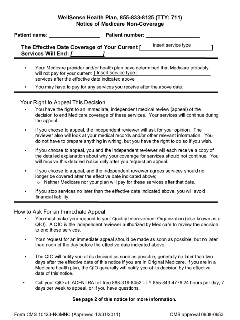 This document serves as a notification of Medicare Non-Coverage (NOMNC) for patients whose Home Care, CORF, Hospice, or Skilled Nursing services are ending. It includes instructions for providers on delivering the notice, the patient\'s rights to appeal the decision, and important contact information for WellSense and the Quality Improvement Organization (QIO).