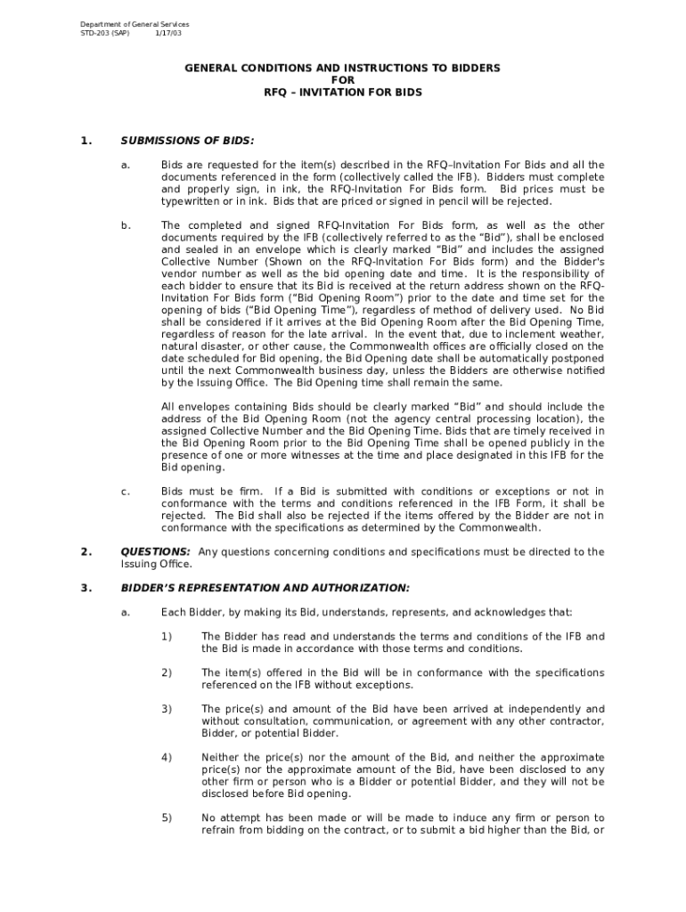 The Rfq - Invitation for Bids is a document that has to be filled-out and signed for specified needs. Then, it is provided to the relevant addressee in order to provide certain info of any kinds. The completion and signing is available in hard copy or via an appropriate service e. g. PDFfiller. These applications help to complete any PDF or Word file online. It also lets you edit its appearance for the needs you have and put a legal e-signature. Once finished, the user ought to send the Rfq - Invitation for Bids to the recipient or several of them by mail and also fax. PDFfiller offers a feature and options that make your template printable. It has various options when printing out. No matter, how you will file a form after filling it out - in hard copy or by email - it will always look well-designed and firm. To not to create a new editable template from the beginning all the time, turn the original form into a template. After that, you will have a rewritable sample.