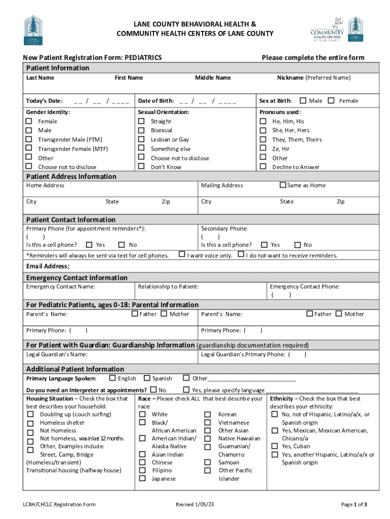 LANE COUNTY BEHAVIORAL HEALTH & COMMUNITY HEALTH CENTERS OF LANE COUNTY New Patient Registration Form: PEDIATRICS Patient Information Last NameTodays Date:Please complete the entire formFirst Name__