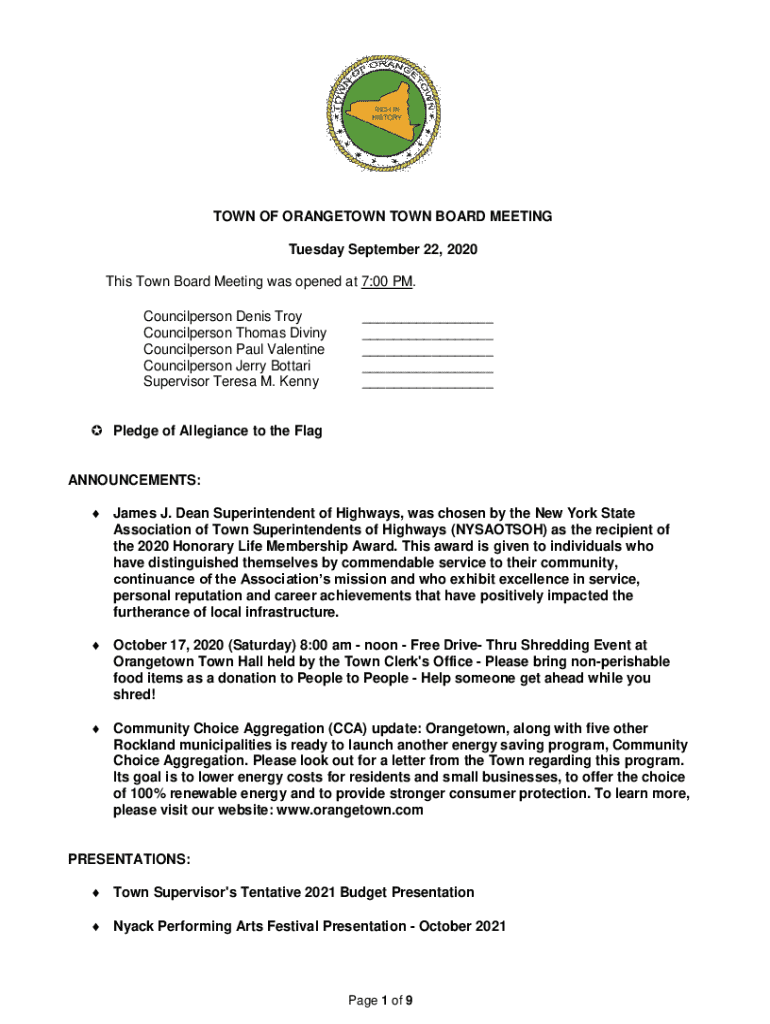 TOWN OF ORANGETOWN TOWN BOARD MEETING Tuesday September 22, 2020 This Town Board Meeting was opened at 7:00 PM. Councilperson Denis Troy Councilperson Thomas Diviny Councilperson Paul Valentine Councilperson