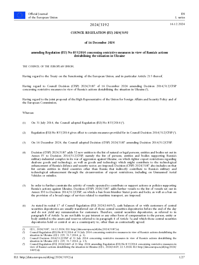 Official Journal of the European UnionEN L series2024/319216.12.2024COUNCIL REGULATION (EU) 2024/3192 of 16 December 2024 amending Regulation (EU) No 833/2014 concerning restrictive measures in view