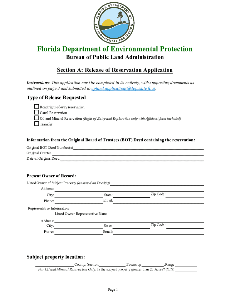 Florida Department of Environmental Protection Bureau of Public Land AdministrationSection A: Release of Reservation Application Instructions: This application must be completed in its entirety, with