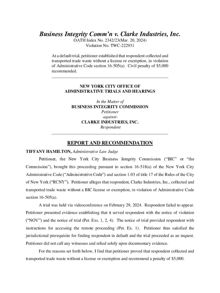 This document is a report and recommendation concerning a violation established by the New York City Business Integrity Commission against Clarke Industries, Inc. for collecting and transporting trade waste without a license, resulting in a recommended civil penalty of $5,000.