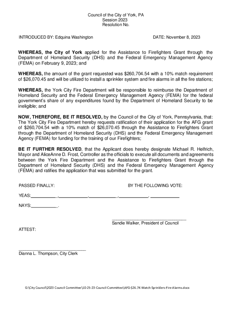 Council of the City of York, PA Session 2023 Resolution No. INTRODUCED BY: Edquina WashingtonDATE: November 8, 2023WHEREAS, the City of York applied for the Assistance to Firefighters Grant through