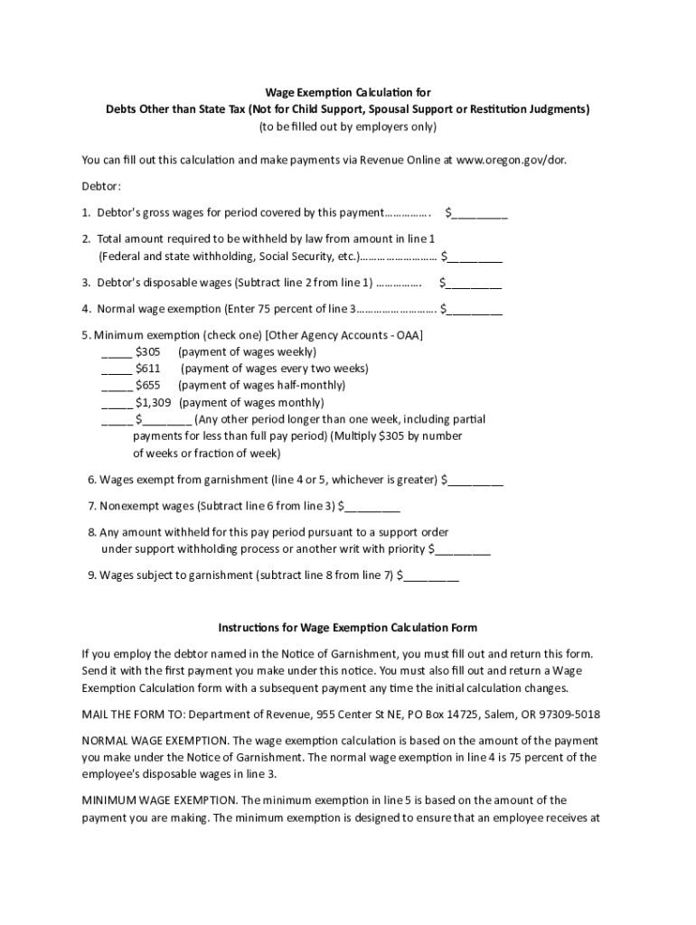 Wage Exemption Calculation for Debts Other than State Tax (Not for Child Support, Spousal Support or Restitution Judgments) (to be lled out by employers only) You can ll out this calculation and make