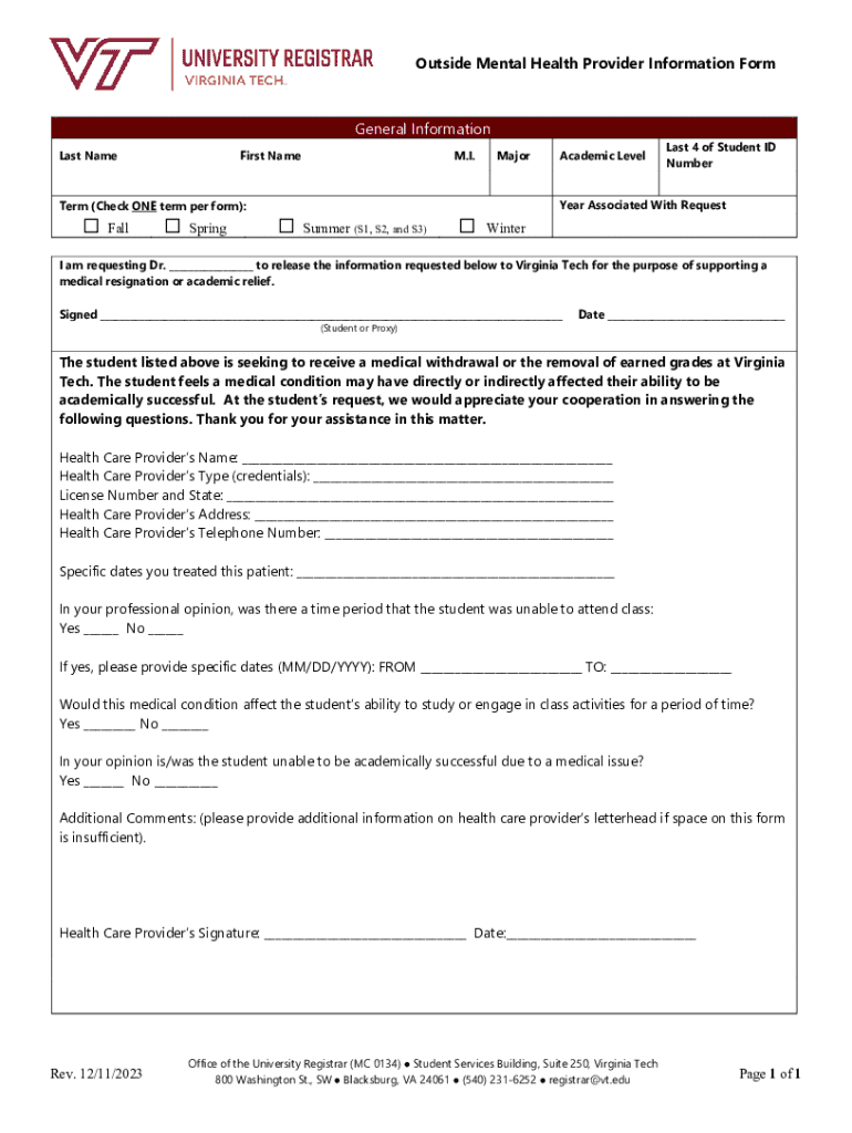 This form is used to request information from healthcare providers to support a student\'s medical resignation or academic relief at Virginia Tech due to mental health reasons. It includes sections for the student and healthcare provider to fill out relevant information regarding the student\'s medical condition and its impact on their academic performance.